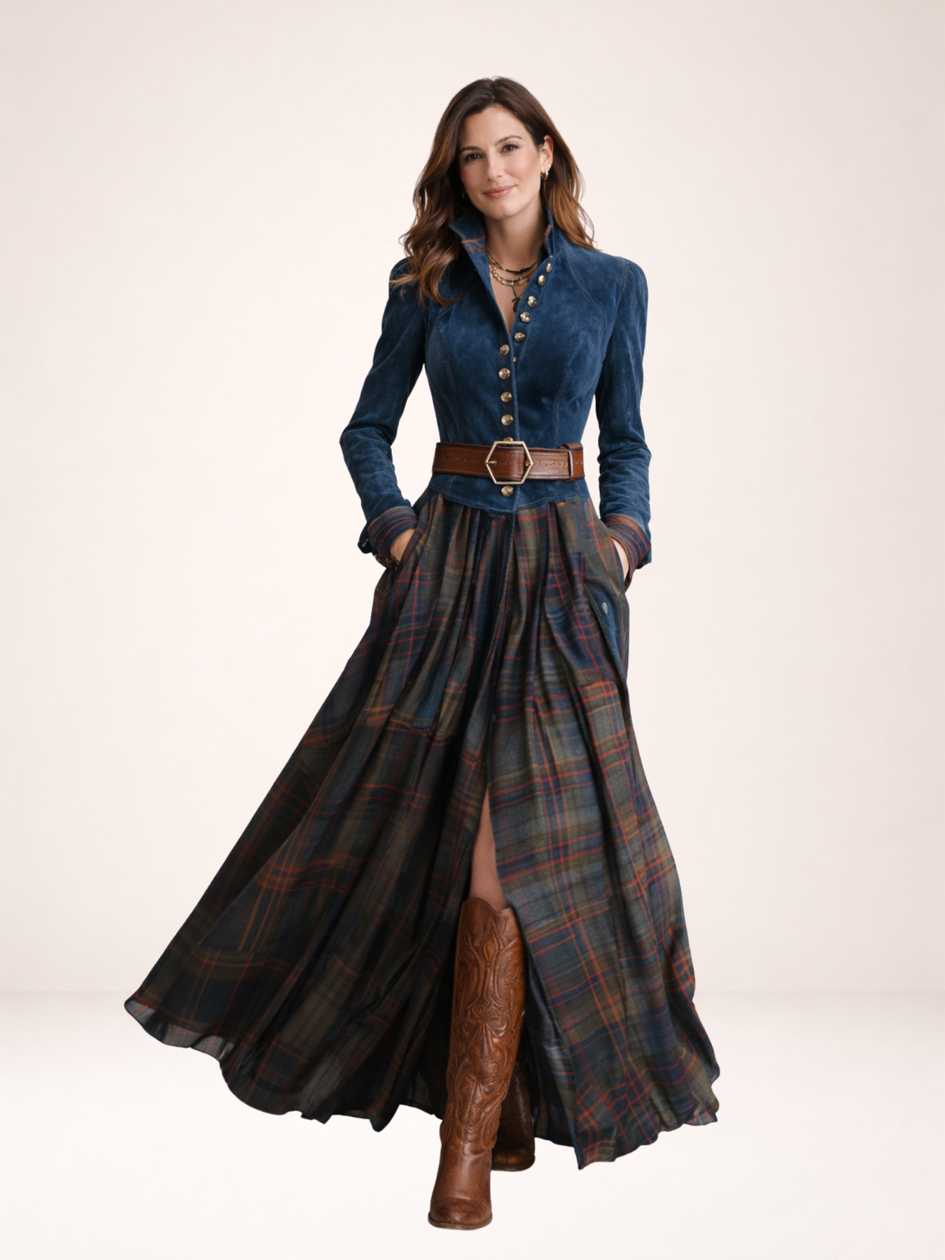 The Ciara Ashbourne Dress is a true statement piece, blending boho-vintage charm with refined strength. Its design features a fitted blue suede-style bodice paired with a flowing plaid panel skirt, creating a powerful, feminine silhouette full of character. Every detail is thoughtfully designed to offer presence without compromising comfort.